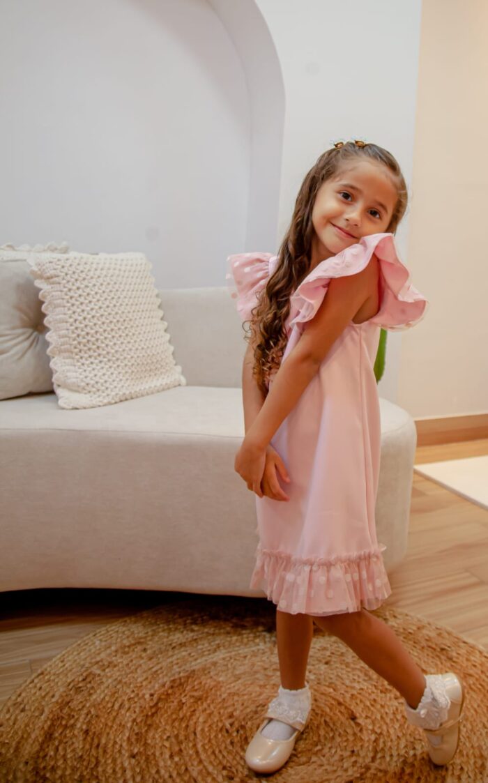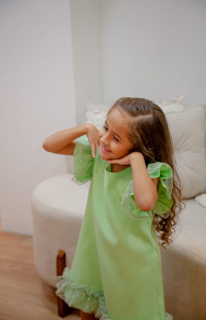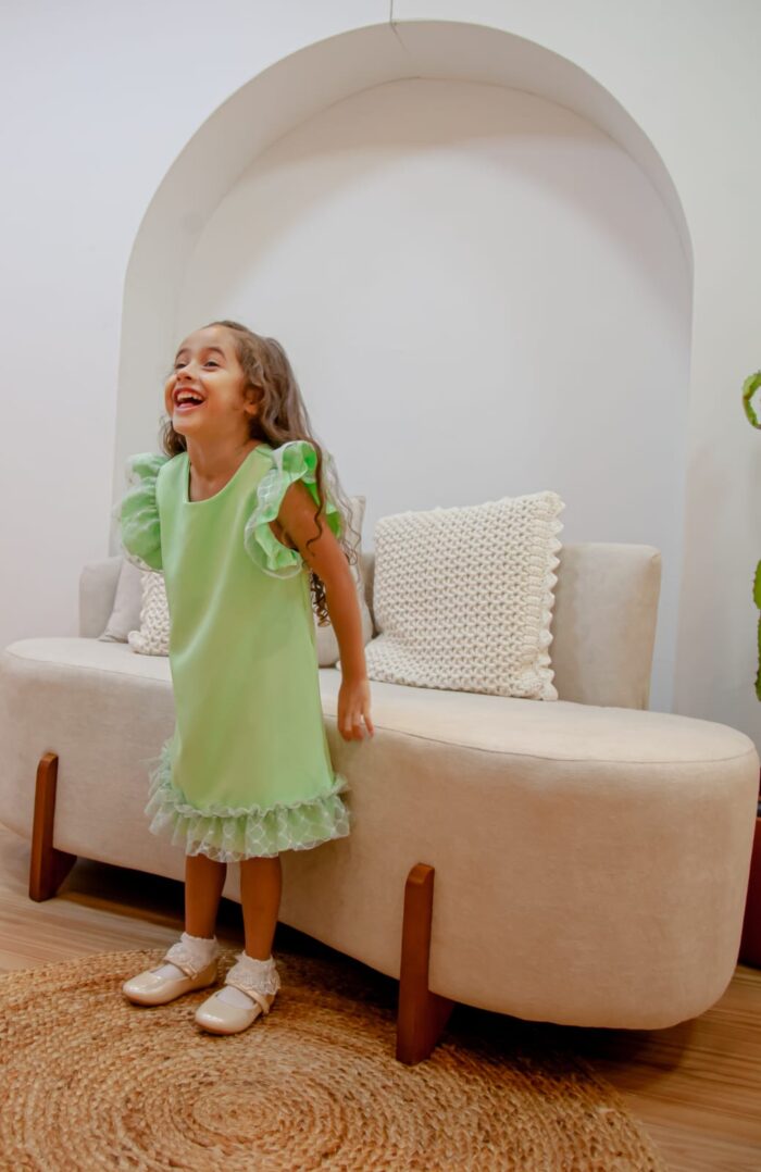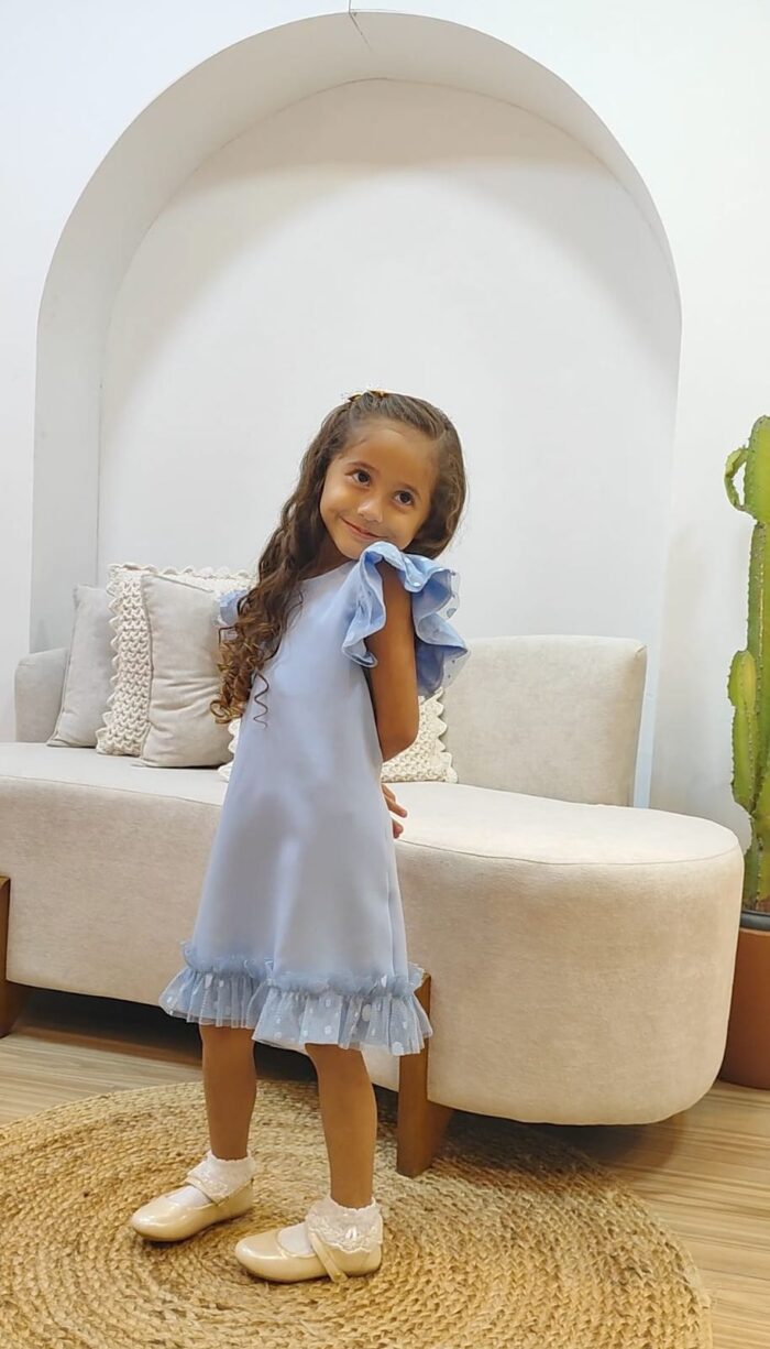 Encante-se com esse vestido delicado e cheio de charme! Com modelagem trapézio, ele garante conforto e elegância para as pequenas em qualquer ocasião. Os detalhes em renda nas mangas e barras dão um toque romântico e sofisticado ao look.